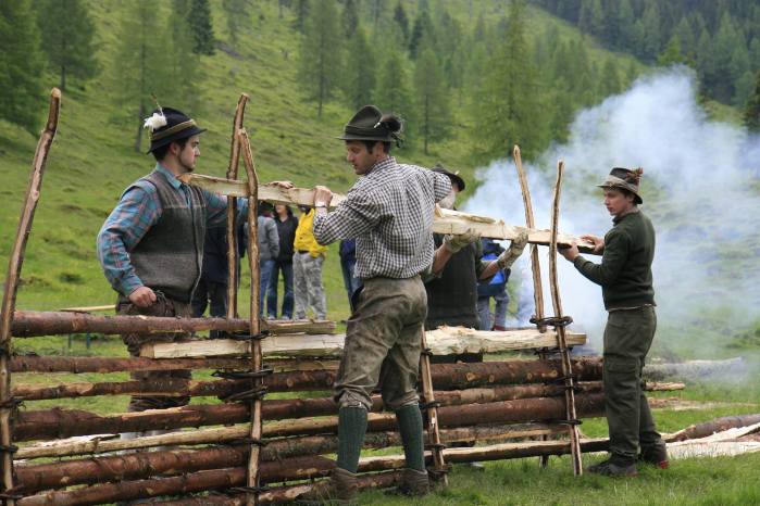 Every year in Feld am See, in the heart of the Carinthian Nockberge Mountains, ancient ways of working in everyday farming are brought back to life and presented to the population as part of an alpine festival. Up until 50 years ago, sophisticated handicrafts such as ring frying, felting or tying brooms were still an integral part of mountain farming annual routine. In order to preserve this age-old way of working for future generations, the Carinthian fence ring roast, unique in Carinthia, was staged as part of an alpine festival 30 years ago. Traditional tools and equipment for peasant work, for the transport and processing of wood by mountain farmers as well as hunters and grooms in original clothing are authentically used and shown.